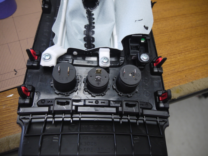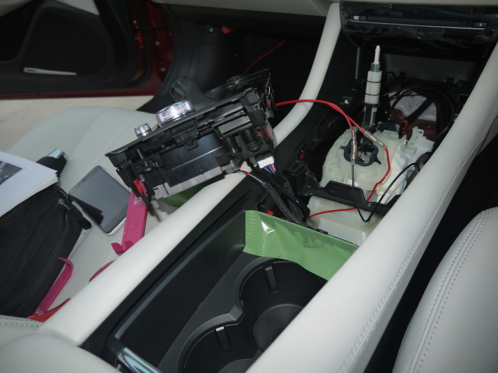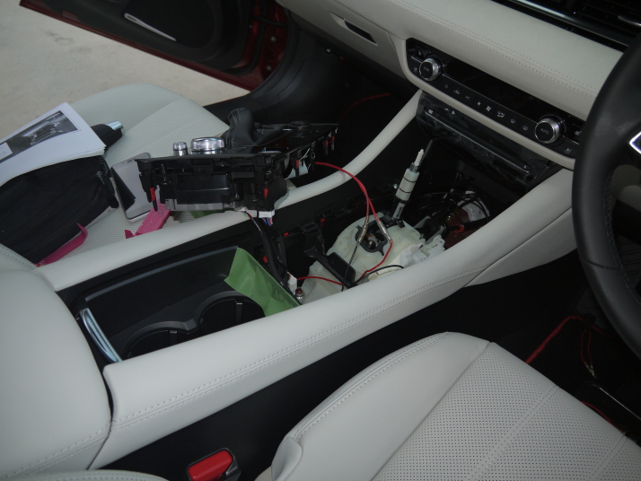 ヘッドレストは先日塗装しておいたので、配線だけでしたので、センターコンソールのシフト部分をばらし、配線して終了。 |