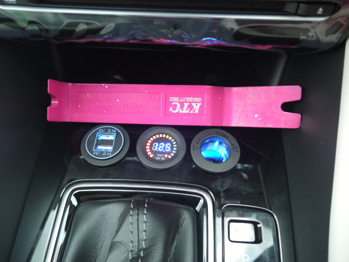 って事で、Amazonで@を購入、左からUSBプラグx2、中央が電圧計、右がシガーソケットです。 電源はセンターコンソールリヤボックス内のAシガーソケットから電源を頂きました。 取付はCシフトレバーパネルに、思いっきり穴を3つ開け取り付けました。 FG完成です。 良い感じですね。 |