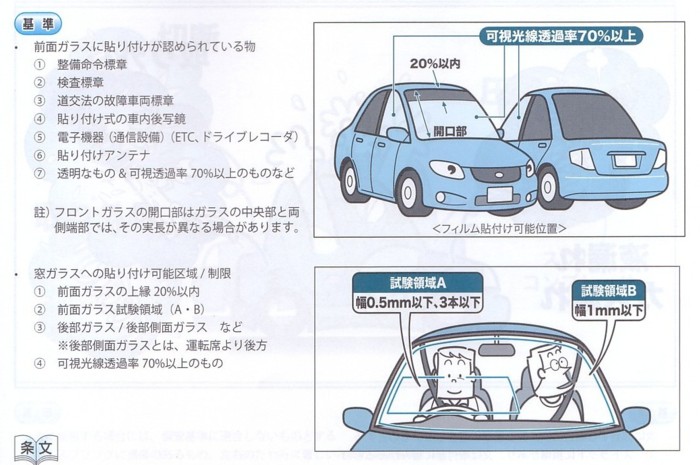 窓ガラスには、貼り付けても良い貼り付け物と指定された区域/制限があるものがあります。また、貼り付け物と同様に窓ガラスへの塗装や刻印についても同様の制限があります。