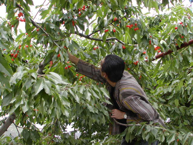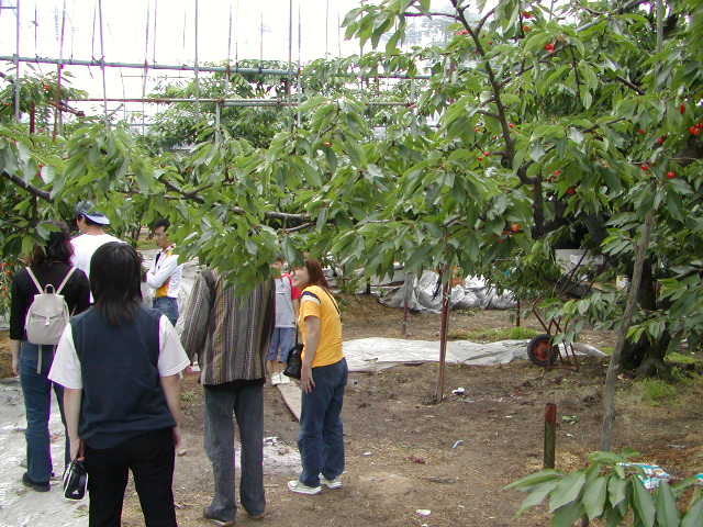山形県寒河江市、 ある農家、送迎付きの さくらんぼ狩です。 |