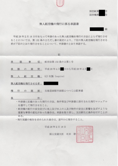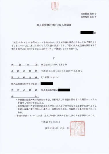 今回の書類を作成するにあたり、国土交通省の担当者の方と5回ほどメールのやり取りをしながら書類を作成致しました。やはり、第一は安全面の対策書類でした。第三者に対しての安全対策です。基本的に第三者の居る上空は飛行禁止、飛行空域には飛行を助言できる係員を置く、最悪の場合の被害を軽減するための機体の装備(プロペラガードなど)はあるか?など、「納得のいく対策でないと許可は出せない」と、言っておりました。