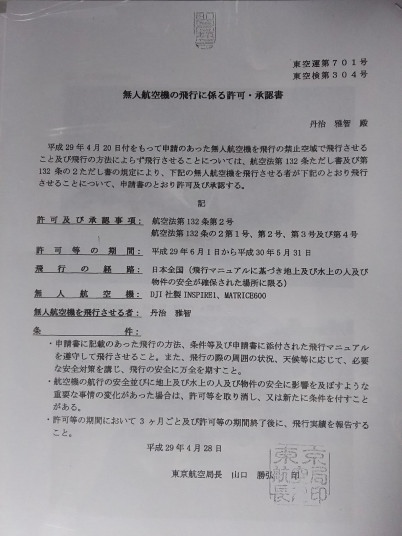 イベント上空&夜間飛行(場所限定)の許可が出ました。