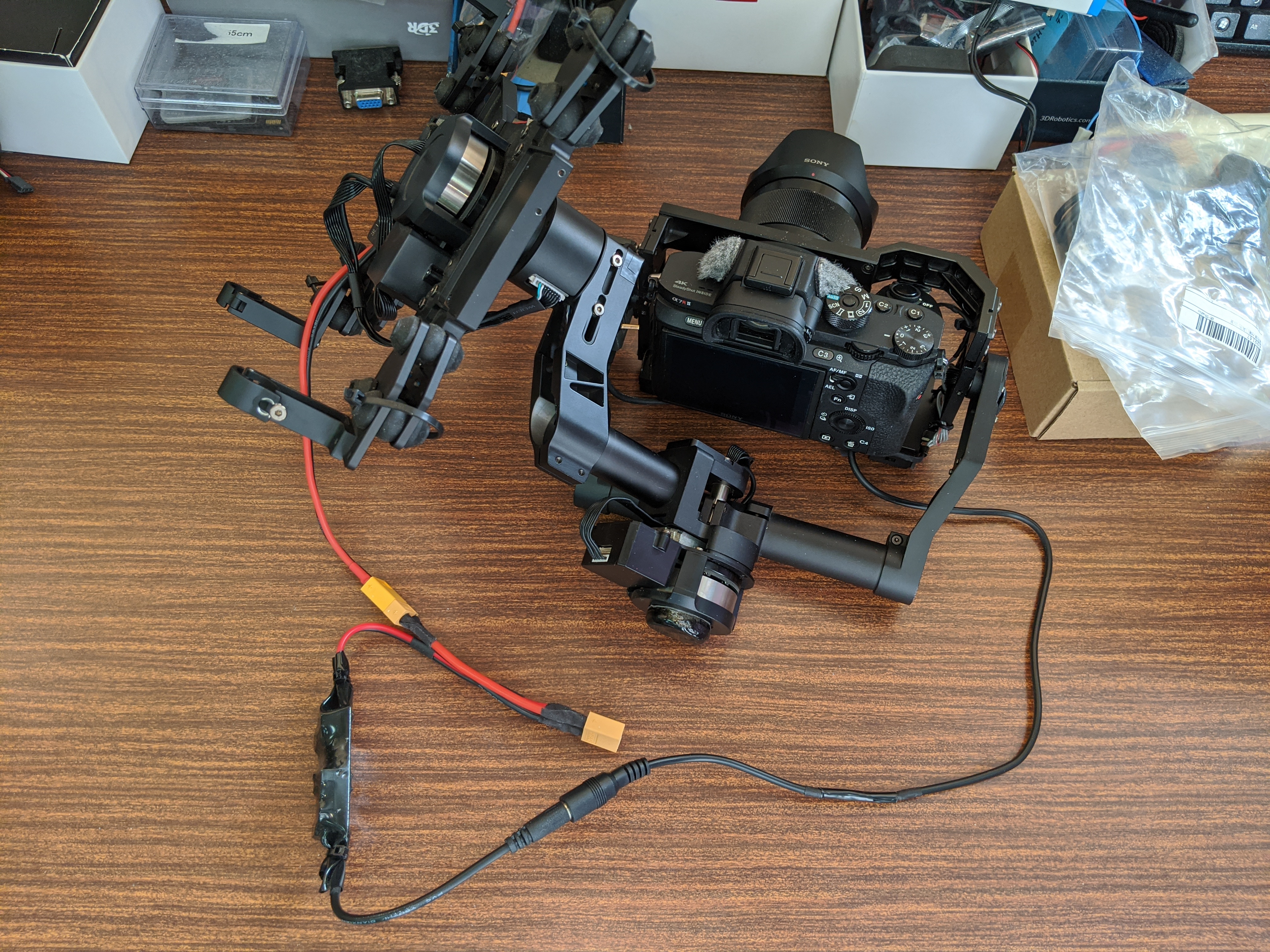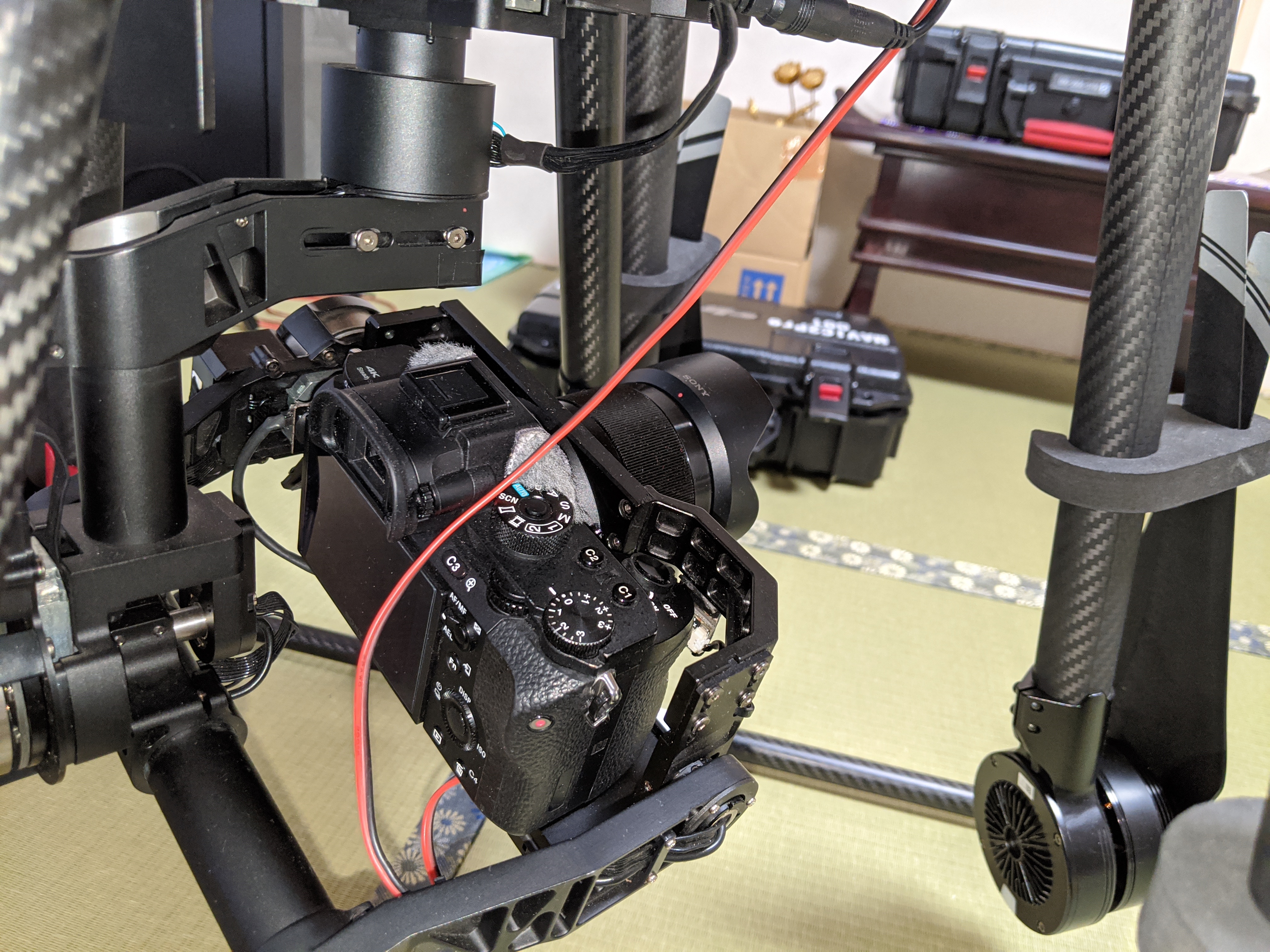 | A7RM2の電源を機体から取るようにしました。 今まではカメラのバッテリーを使用してたため、1フライトの度にバッテリーを交換しないといけませんでした。 その度にカメラを外すのは、本当に面倒でしたのよ〜。 で、ダミーバッテリーにDC-DCコンバーターにて、24V→8Vにダウンして引き込みました。 |