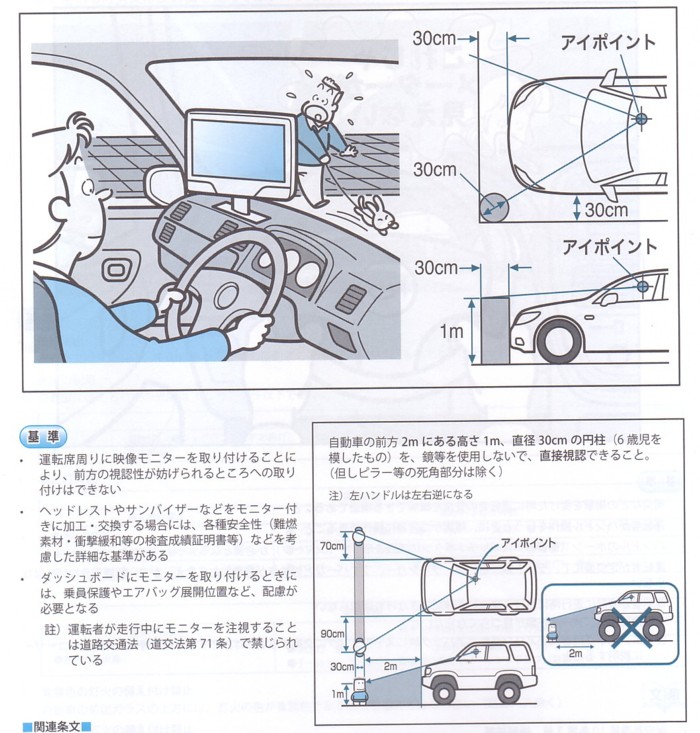モニターに関しては、明確な保安基準は無いようですが、視界確保の基準に満たさないような取り付けの場合は基準外となりますので注意してください。