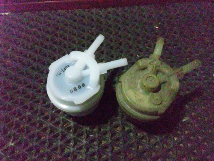 80000キロ乗ってればフィルターも汚いでしょうね〜・・・。ってことで、まずはフィルターを交換しました。社外品で980円、純正は1200円くらい? さて、インプレッションですが、ずいぶん改善しました。ですが新車の状態を知らないので、完璧に改善したかどうかは不明です。 |
